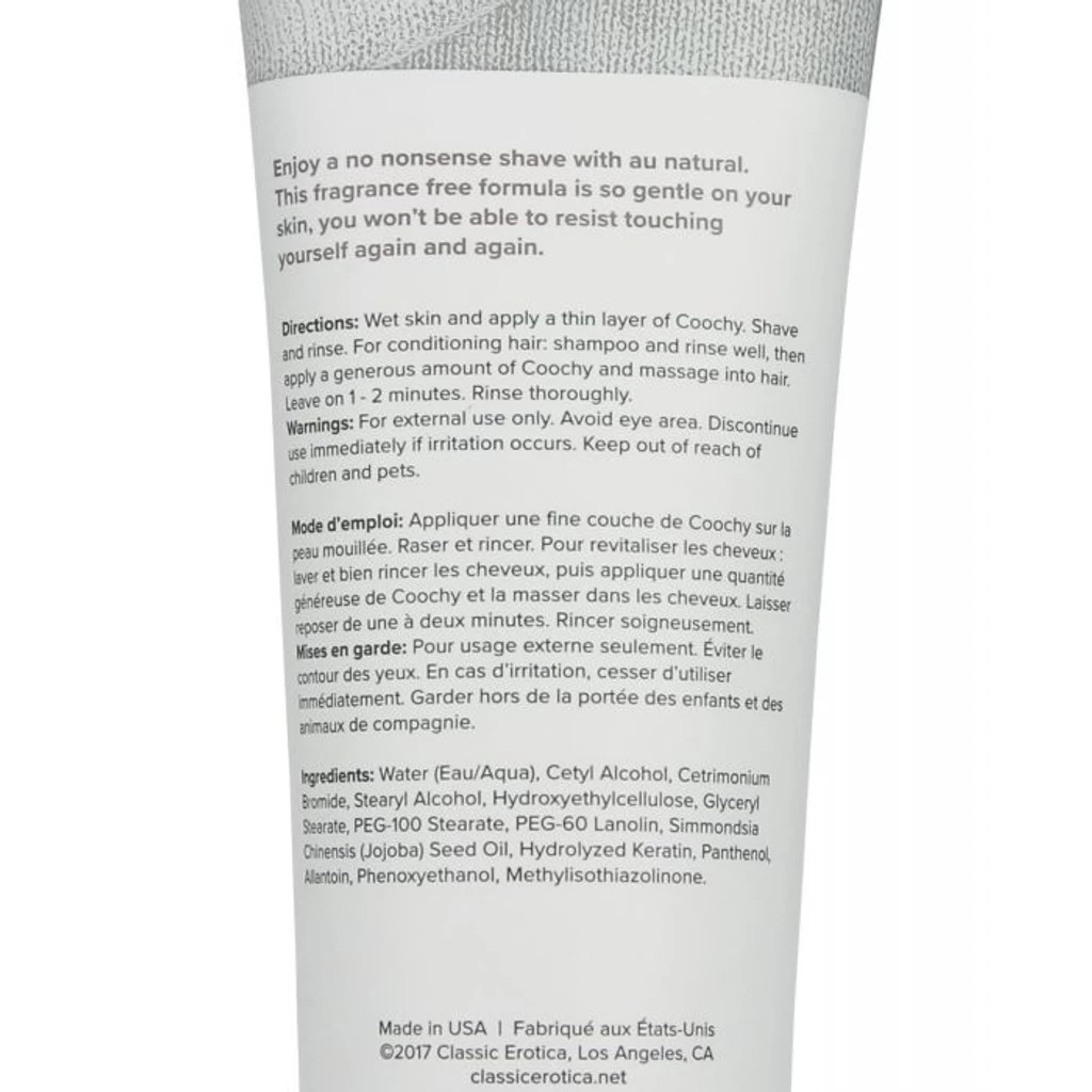 Coochy Rash Free Shave Cream dramatically reduces cuts, nicks, scrapes and razor irritation. It contains a special conditioner and moisturizing complex that provides an effortless glide for an oh so smooth shave. Your coochy will love you for it! Why It’s Different: The conditioner and moisturizing complex provides the perfect lubrication and razor glide. Jojoba Seed Oil provides a protective barrier for skin and helps seal in moisture. COOCHY does not contain unnecessary foaming agents. Tip: As with any shaving cream, soak skin and exfoliate before shaving. If necessary, follow with an after-shave protection mist. Au Natural enjoy a no nonsense shave with au natural. This is the Fragrance Free Formula. 3.4 ounce Tube