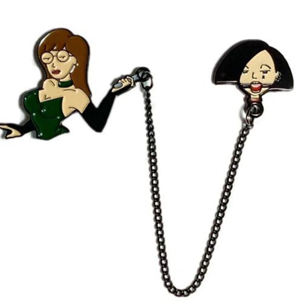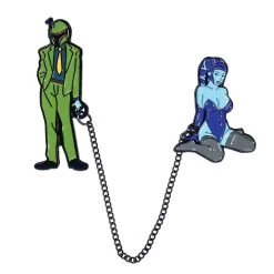 Two 2″ Soft Enamel pins (some connected by chains). Each pin has 2 rubber backers.