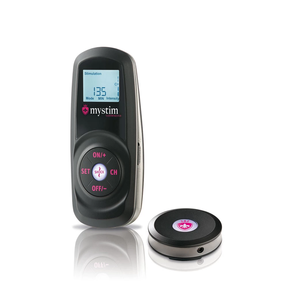The Mystim Cluster Buster comes with a stylish storage box, a remote control, a receiver, a bi-polar electrode and a user manual. The device is “only” supplied with a receiver, but can control an unlimited number of receivers, the “Mystim Sultry Subs”. This means that with only one device, an unlimited number of electrosex toys can be controlled. These toys can be grouped into a total of 8 channels, each of these channels is completely separate from each other and can stimulate in its own program and intensity.
