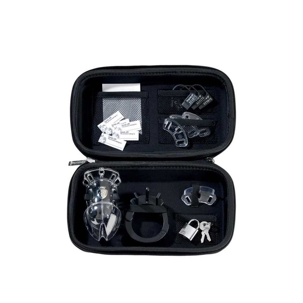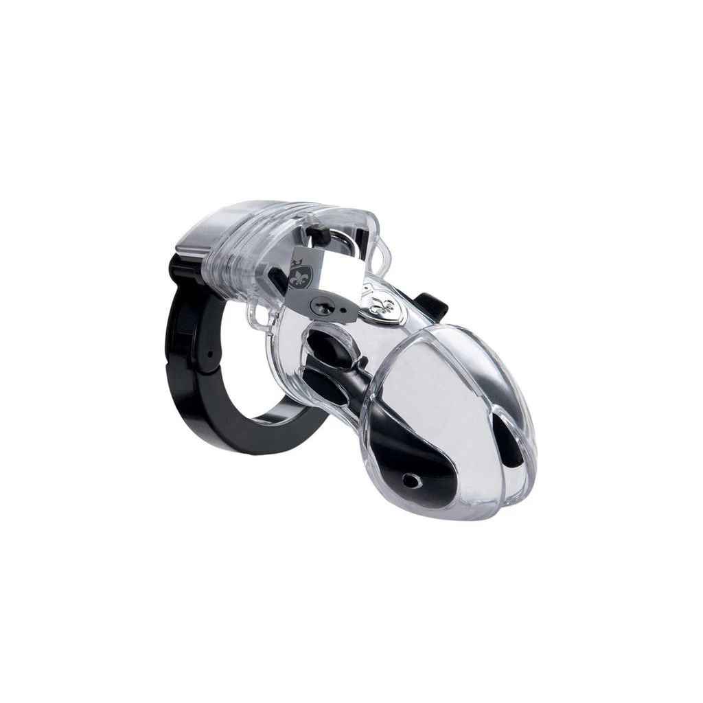 The Pubic Enemy No 1 is a neat and transparent cock cage with e-stim function: He keeps a boisterous willy pent up under lock and key so that he can’t get stiff until the mistress, or the master, comes with the key and lets him out. With the conducting surfaces, left and right, the prisoner can be treated with tingles, twitches or pulsations in precisely the intensity he deserves. Because his conductive surfaces can be taken out in no time at all, this chastity belt for wayward gentlemen is perfect even for those who haven’t yet discovered e-stim. And if a prisoner gets too cocky later, the conductivity can easily be restored.