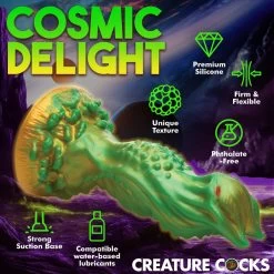 This cute Andromeda alien is the perfect size to crawl inside your most intimate of places! Green and gold skin shine when light hits it. Two narrow, red eyes watch you with a menacing glare. The head has small, soft ears, a narrow face and a bumpy, large chest that makes the dong swollen at the center. It is textured for your pleasure and will satisfy you in new ways that only this alien can deliver! Made out of premium, flexible, phthalate-free silicone, this dong is body-safe and best used with water-based lubricants only. Enjoy hands free rides due to the strong suction cup base! Invite a partner to indulge in kinky cosplay or fantasy roleplay and use their favorite harness to transform this dong into a strapon! Afterward, make sure to wash it with warm water and mild soap, then spray it with a toy cleaner and air-dry. Keep out of direct sunlight and heat.