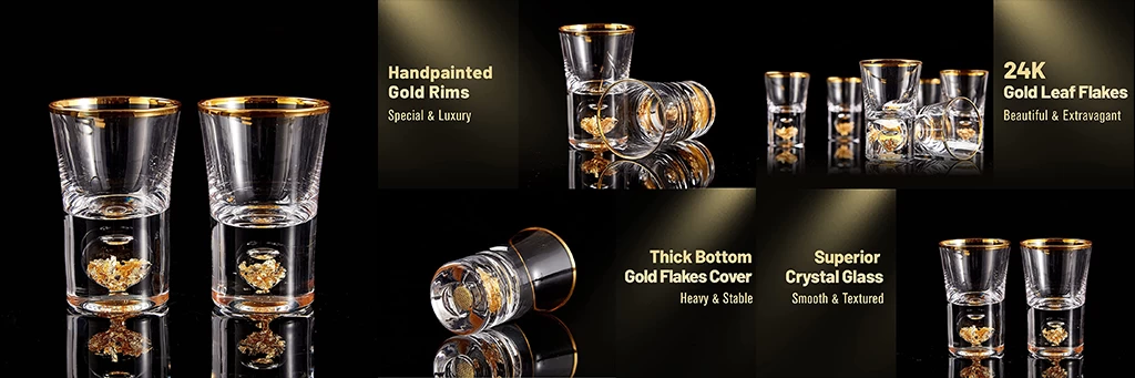 This shot glass set is decorated with 24K gold rim, and the bottom is filled with gold foil, luxurious and gorgeous. The gold rims are handmade by skilled craftsmen, pursuing perfection. The design concept of this set is to be unique and extravagant.