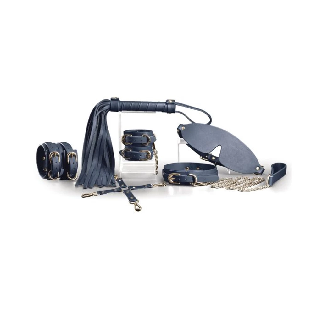 Bondage Couture brings your BDSM roleplaying fantasies to life with an all-in-one 6-piece kit of top-quality faux leather restraints and accessories, including wrist and ankle cuffs, collar and leash, hog-tie, blindfold, and whip.
