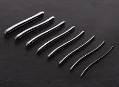 In body safe stainless steel, the 8 Hegar sounds are naturally extremely firm and quite weighty. Each Sound is identical in shape – there’s a slight curve to each tip and lots of very subtly widening length in between. The smallest rod measures in at 8″ (20.3cm) long and just over .11″ (3mm) in smallest diameter, while the largest measures 8″ (20.3cm) long and about .67″ (1.7cm) in diameter. There are 6 sizes in between, so you’ll easily be able to find one that suits your need, desire or experience level.