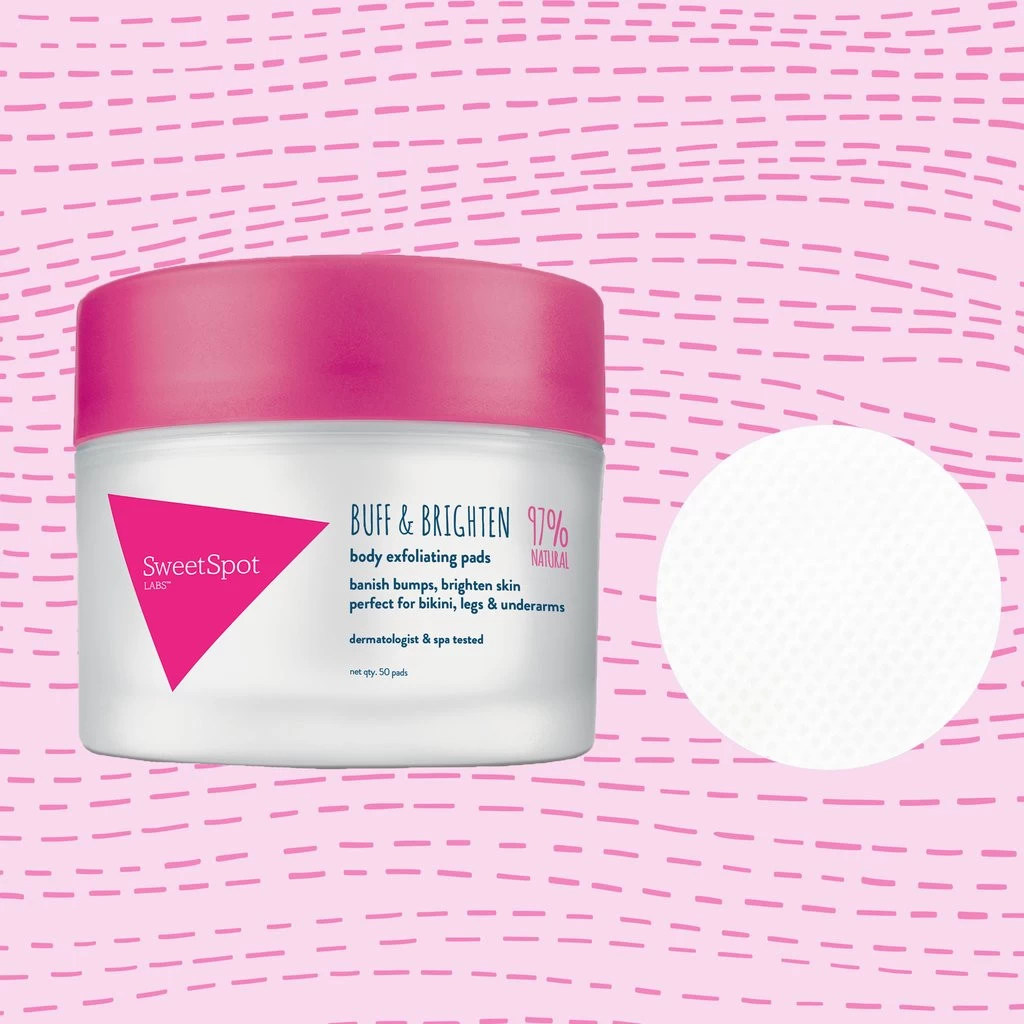 SweetSpots Labs Buff and Brighten Body Exfoliating Pads smooth ingrown hairs, Brazilian-born bumps and razor irritation, while brightening the shadows and darkness associated with repeated shaving on your underarms, bikini area or legs. Formulated with a woman’s chemistry in mind, these supersized, pH balanced pads gently exfoliate and prevent uncomfortable ingrown hairs, bumps and razor irritation with a blend of glycolic acid, papaya and pineapple enzymes. That’s the buff part. Brightening for all different skin tones happens when clean, natural aloe vera and organic witch hazel water go to work soothing away shadows, darkness and redness. FREE FROM glycerin, sulfates, parabens, phthalates, harmful plastics, MIT preservatives, propylene glycol, gluten, dairy or soy. Cruelty free and vegan.